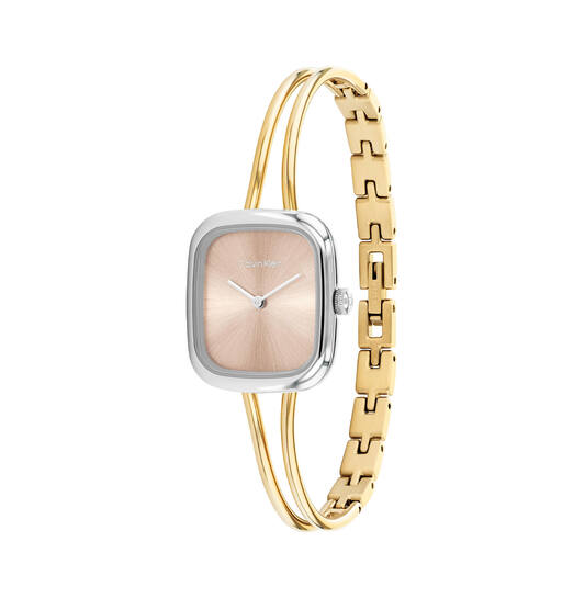 Dit product, modelnummer 25100134, is een elegante polshorloge met een goudkleurige roestvrijstalen band en een roestgoudkleurige wijzerplaat. Het heeft geen datumfunctie en is niet slim, maar heeft een waterdichtheidsniveau van 3. Perfect om te dragen bij zowel formele als informele gelegenheden voor een stijlvolle uitstraling.