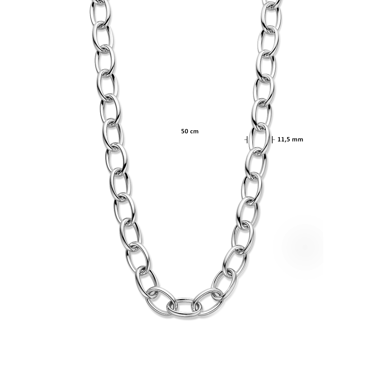 Dit product, Collier Anker 11,5 mm 50 cm, modelnummer 1338250, bevat de volgende kenmerken: het is een zilverkleurige ketting, gemaakt van rhodium-geplateerd materiaal, met een glanzende afwerking. Breedte: 11,5 mm, gewicht: 82,91 gram. Draag deze stijlvolle ketting als middelpunt van je look voor een elegante touch bij elke gelegenheid.