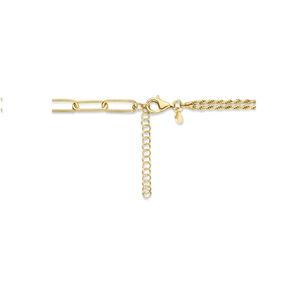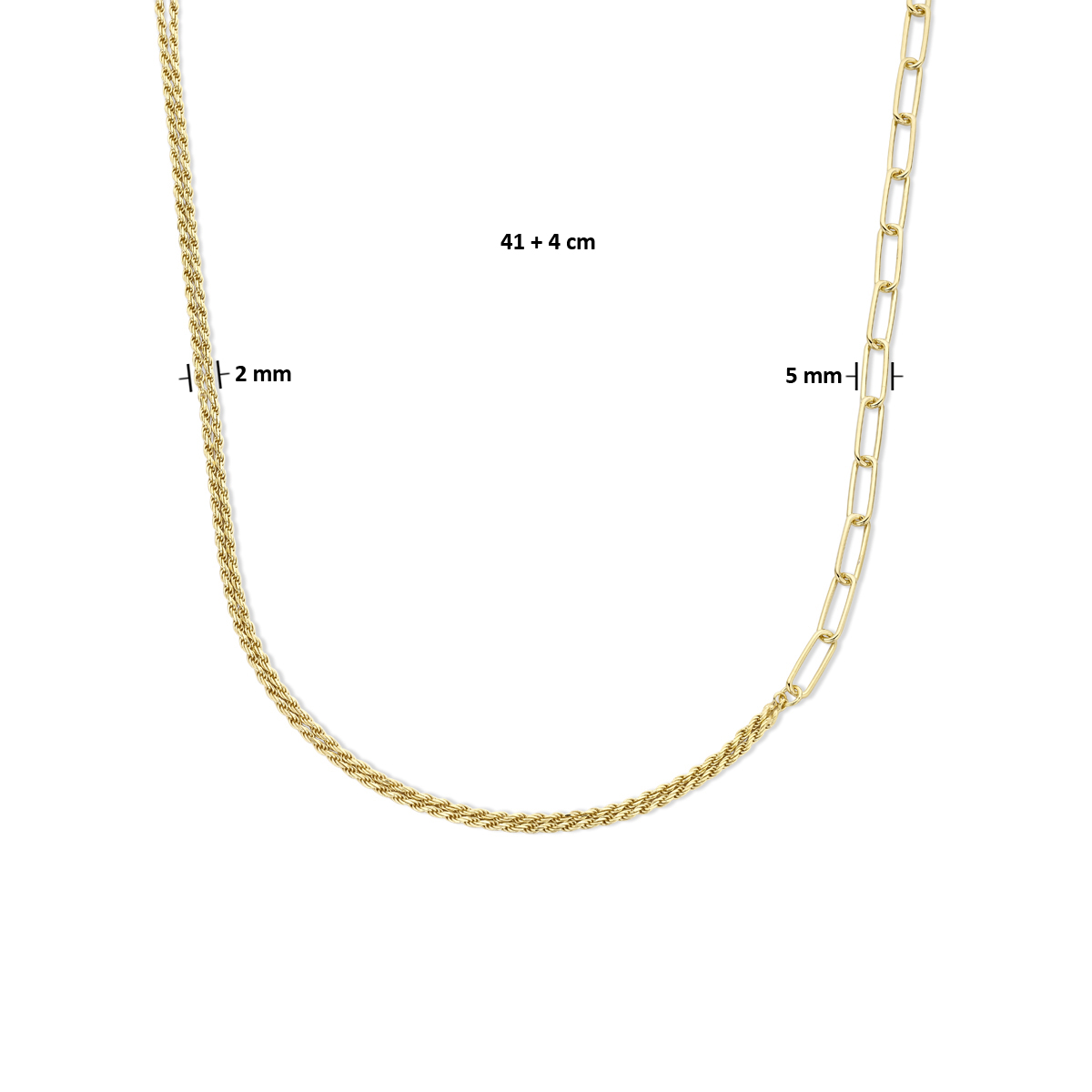 De Combi-collier koord en paperclip, modelnummer 2102690, is een prachtige zilveren ketting in goudkleur van 5 mm met een gewicht van 10,7 g. De ketting glanst schitterend en geeft elke outfit een elegante touch. Draag hem solo voor een subtiele look of combineer met andere kettingen voor een gelaagde stijl. Perfect voor elke gelegenheid.