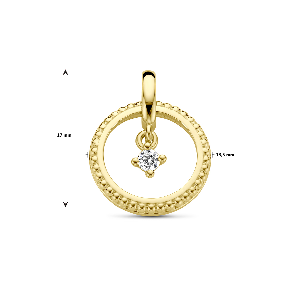 De Hanger Cirkel Diamant 0.06ct H SI, modelnummer 4029044, is een verfijnde gouden bedel met een gewicht van 1.6g en een diameter van 13.5mm. De ronde vorm en glans maken het een schitterend accessoire. Draag het als een subtiele toevoeging aan een ketting of armband, ideaal voor elke gelegenheid. Perfect voor een elegante look.