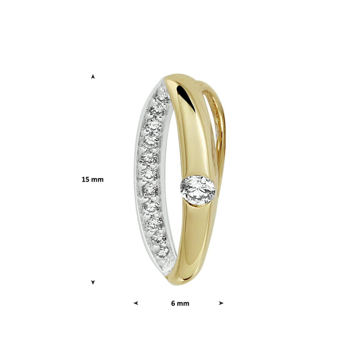 14k Bicolor geel- en witgouden hanger uitgevoerd met schitterende diamanten. De hanger heeft een totale hoogte van 15mm.