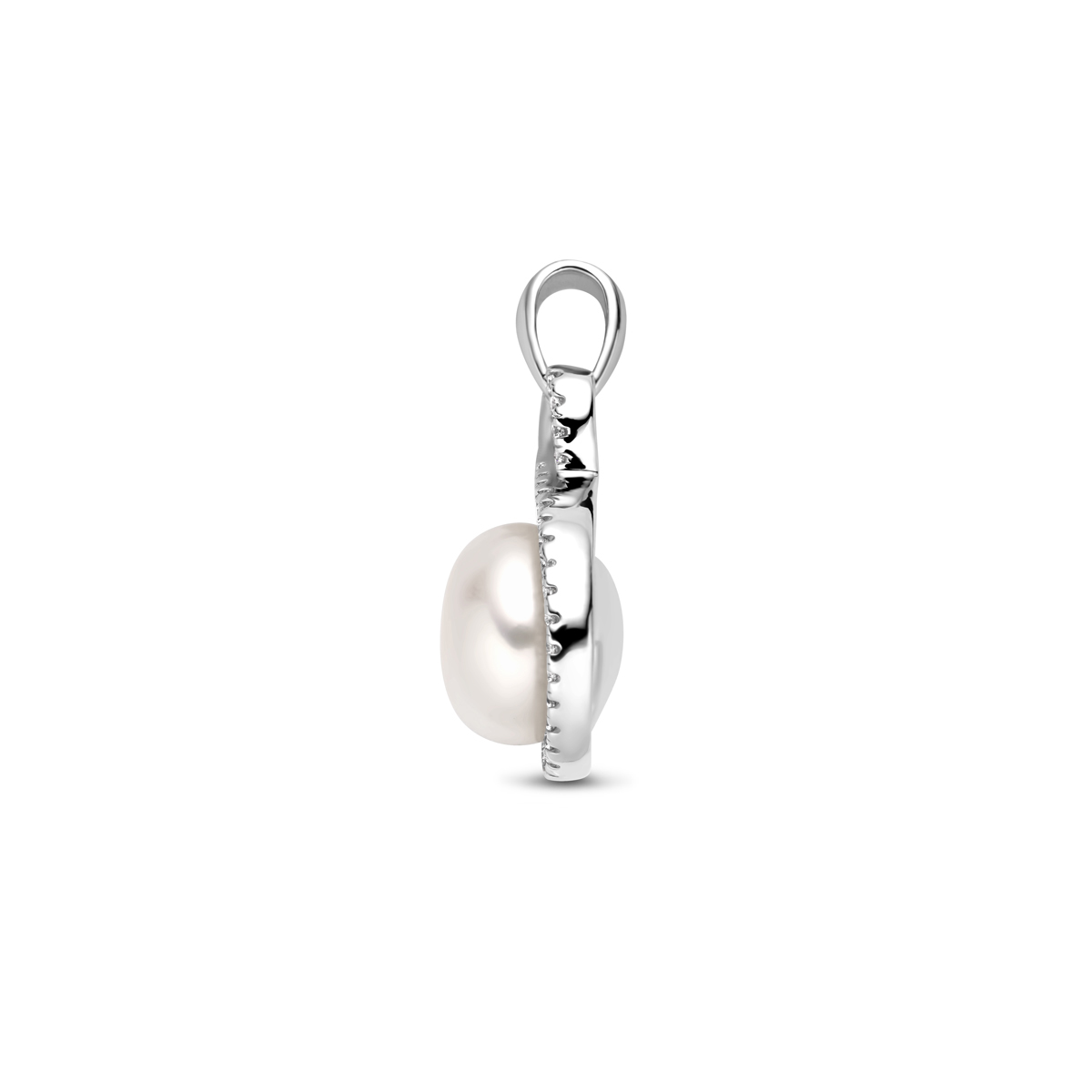Gerhodineerd 925 zilveren hanger uitgevoerd met zirkonia en parel. De hanger heeft een totale hoogte van 24.4mm.