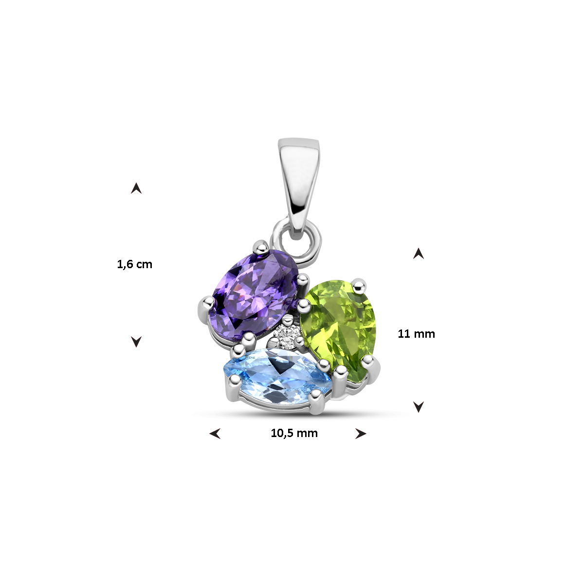 Gerhodineerd 925 zilveren hanger uitgevoerd met vier stenen: zirkonia, zirkonia amethist, synth. blauw spinel en synth. peridot. De hanger hebben een totaal hoogte van 16mm.