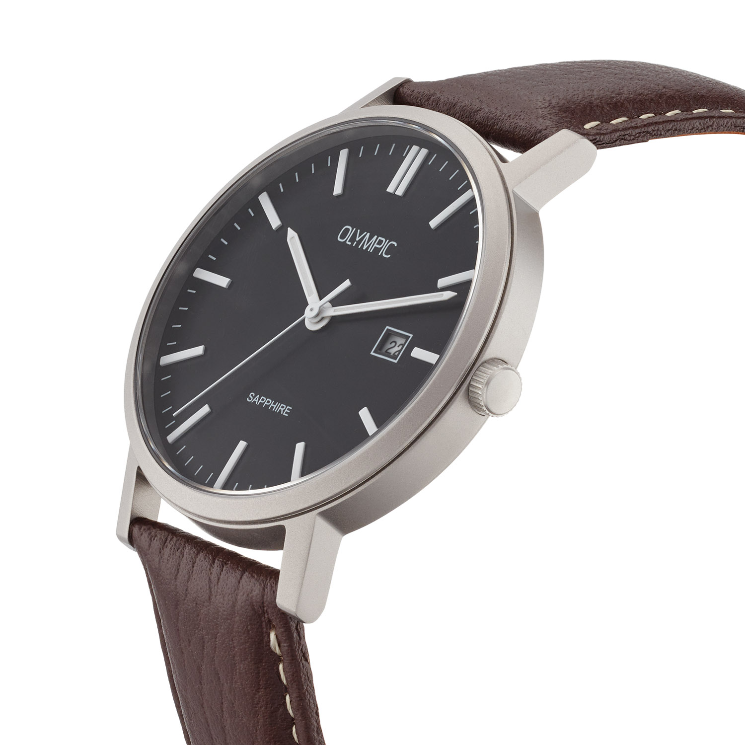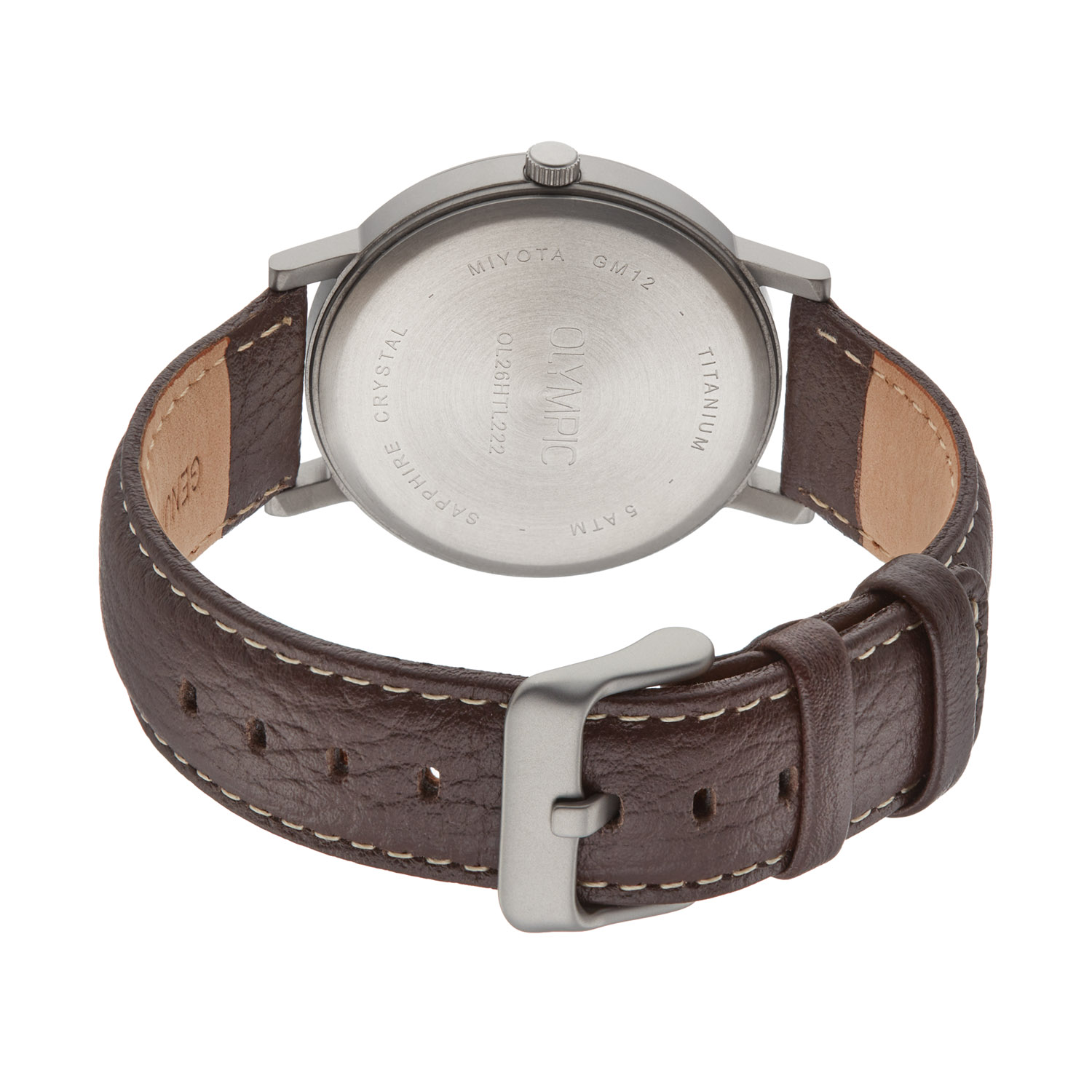Dit unieke Olympic horloge met artikelnummer: OL26HTL222 is een herenhorloge met een classic sportieve uitstraling. Het horloge heeft een ronde titanium kast met een zwarte wijzerplaat met een datum. Aan de kast zit een bruine lerenband met een gespsluiting. Het horloge heeft een saffierglas, een doorsnee van 40mm en is 5ATM.