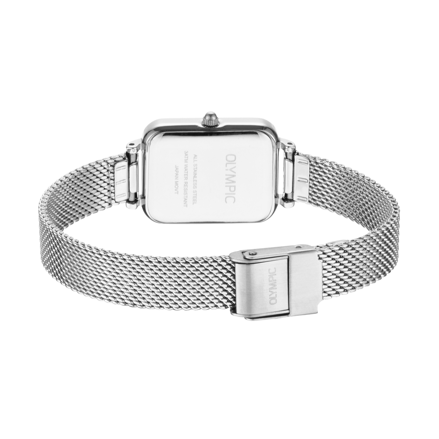 Dit unieke Olympic horloge met artikelnummer: OL66DSS023 is een stijlvol dameshorloge. De zilverkleurige rechthoekige stalen kast heeft een gladde bezel en een witte wijzerplaat. De uursaanduiding is verfijnd door de strakke wijzers en de arabische cijfers. Dit geeft het horloge een chique uiterlijk. Aan de stalen kast zit een fijne zilverkleurige milanese band met een druksluiting. Het horloge heeft een mineraalglas, een afmeting van 20x26mm en is 3ATM.