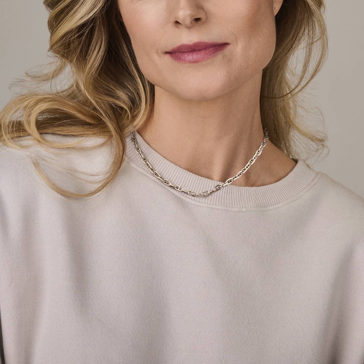 Dit zilveren collier, modelnummer 1338043, kenmerkt zich door zijn ronde buisvormige ontwerp, stralende glans, en robuuste Ronde Marine schakelketting. Met een gewicht van 12,6 gram en een breedte van 6 mm, biedt het een stijlvolle en elegante uitstraling. Het heeft een stevige karabijnsluiting voor extra veiligheid. Draag het bij formele gelegenheden of als verfijnde toevoeging aan dagelijkse outfits.
